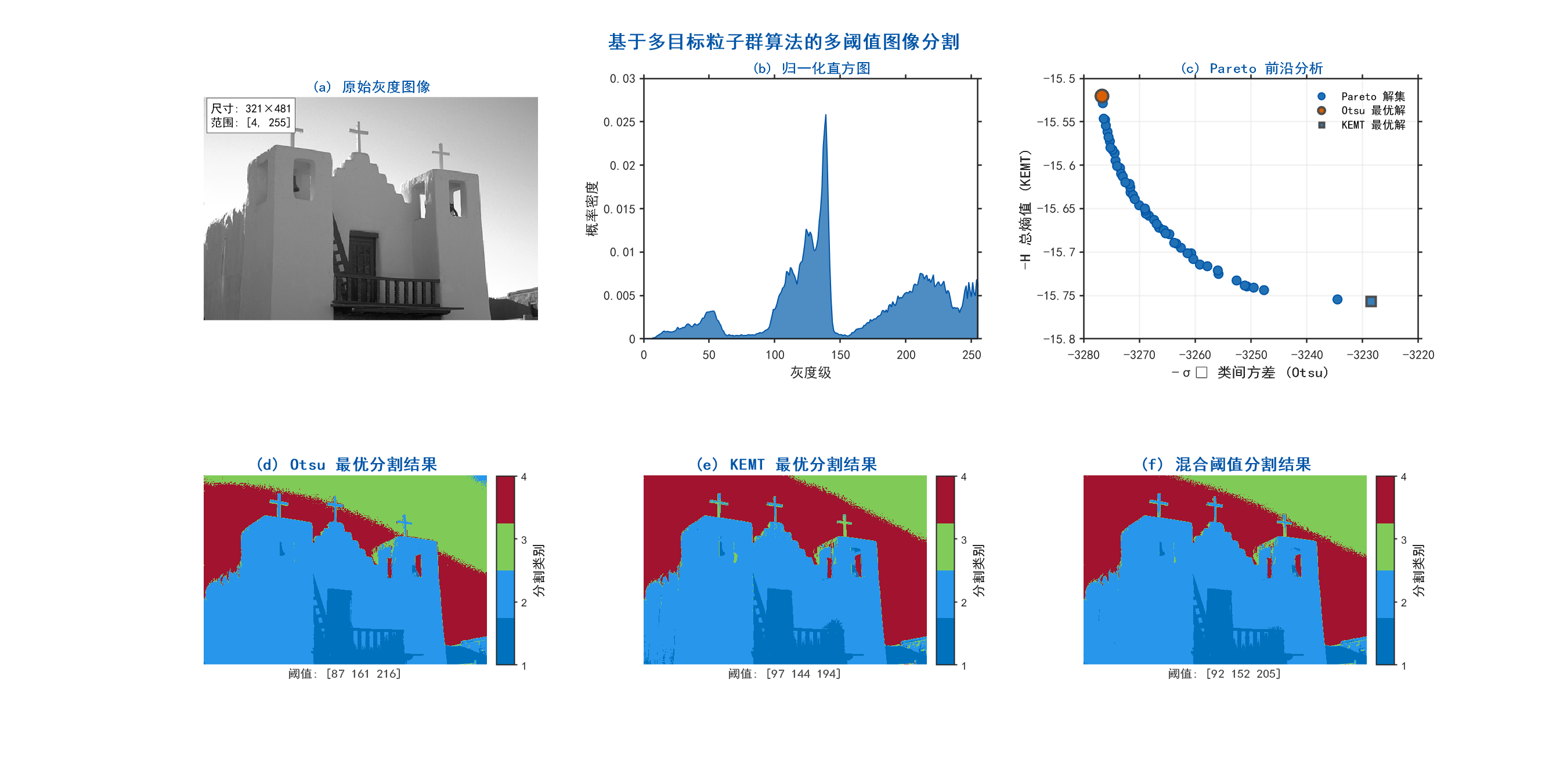 1\] Coello C A C, Pulido G T, Lechuga M S. Handling multiple objectives with particle swarm optimization\[J\]. IEEE Transactions on evolutionary computation, 2004, 8(3): 256-279. \[2\] 卞乐, 霍冠英, 李庆武. 基于 Curvelet 变换和多目标粒子群的混合熵 MRI 图像多阈值分割\[J\]. 计算机应用, 2016, 36(11):3188-3195. \[3\] Maryam H, Mustapha A, Younes J. A multilevel thresholding method for image segmentation based on multiobjective particle swarm optimization\[C\]//2017 International Conference on Wireless Technologies, Embedded and Intelligent Systems (WITS). IEEE, 2017: 1-6. \[4\] Naderi Boldaji M R, Hosseini Semnani S. Color image segmentation using multi-objective swarm optimizer and multi-level histogram thresholding\[J\]. Multimedia Tools and Applications, 2022, 81(21): 30647-30661. \[5\] Kanadath A, Angel Arul Jothi J, Urolagin S. Multilevel multiobjective particle swarm optimization guided superpixel algorithm for histopathology image detection and segmentation\[J\]. Journal of Imaging, 2023, 9(4): 78. ## 5 改进方向 * 改进多目标粒子群算法,然后在阈值分割领域进行应用。 * 改进阈值分割函数获取图像不同维度的特征(参考文献 3),然后应用多目标粒子群算法获取阈值。 * 不同领域图像数据集处理。面向不同领域图像的特征,设计不同的阈值分割函数,然后应用多目标粒子群算法获取阈值(例如医学图像分割领域,参考文献 2 和 5)。 * 彩色图像处理(参考文献 4)。 * 将优化算法推广至多目标领域。 博主可辅助上述 2-4 点的算法改进,1 和 5 需具备大量数学基础,从头到尾推导明白优化算法的全过程,博主怕误人子弟。 ## 6 MATLAB 代码 代码中包含详尽的注释!