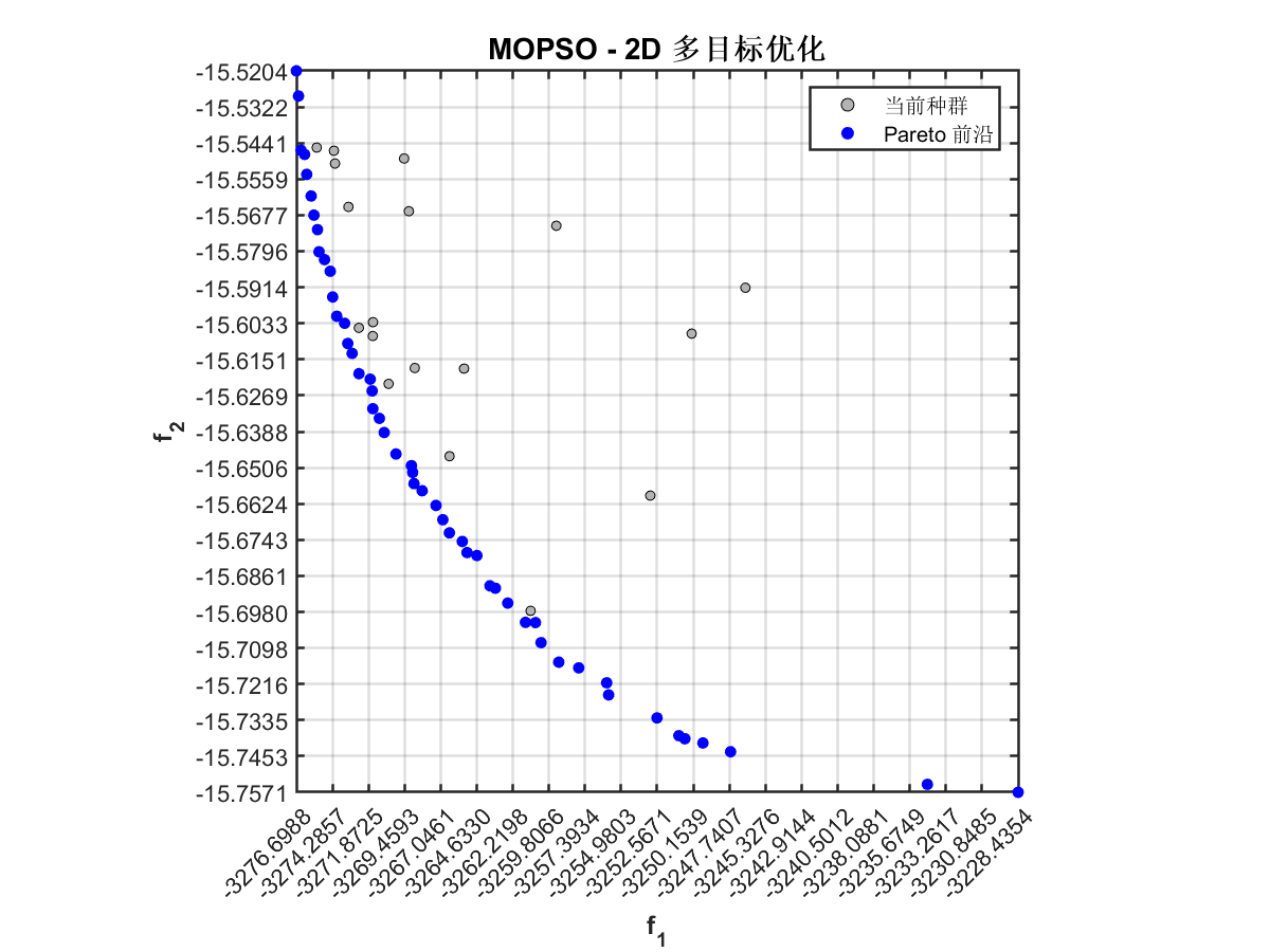在每一代迭代中,每个粒子根据自身历史最优位置(localbest\text{localbest}localbest)和从外部存档(保存当前找到的 Pareto 非支配解集)中选出的全局引导者(globalbest\text{globalbest}globalbest)来更新其速度 vi\mathbf{v}_ivi 和位置 xi\mathbf{x}_ixi: