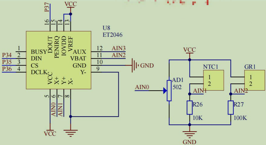 AIN1引脚的电压会跟着变 ------XPT2046 测这个电压,就能算出当前温度(比如 25℃、30℃)。 -