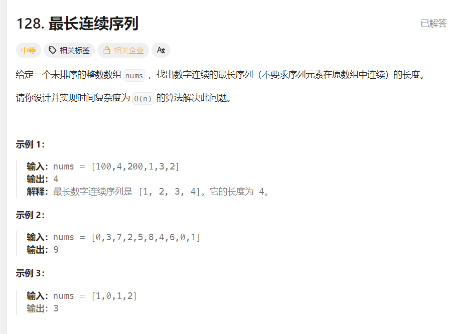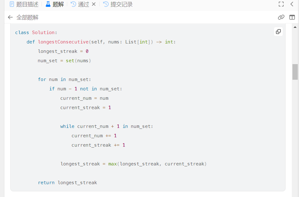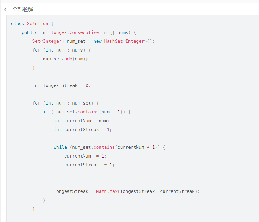 增加了判断跳过的逻辑之后,时间复杂度是多少呢?外层循环需要 O(n) 的时间复杂度,只有当一个数是连续序列的第一个数的情况下才会进入内层循环,然后在内层循环中匹配连续序列中的数,因此数组中的每个数只会进入内层循环一次。根据上述分析可知,总时间复杂度为 O(n),符合题目要求。