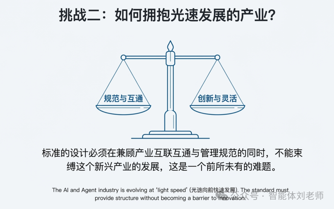 如何适应快速发展的智能体产业?人工智能、大模型、智能体的相关技术,目前可以说正以光速向前快速发展中。与此相对应的,智能体与智能体互联产业,也是一个新兴且快速发展的产业。如果兼顾产业互联互通需求、行业管理规范,同时又不能束缚行业的发展,这是一个前所未有的难题。