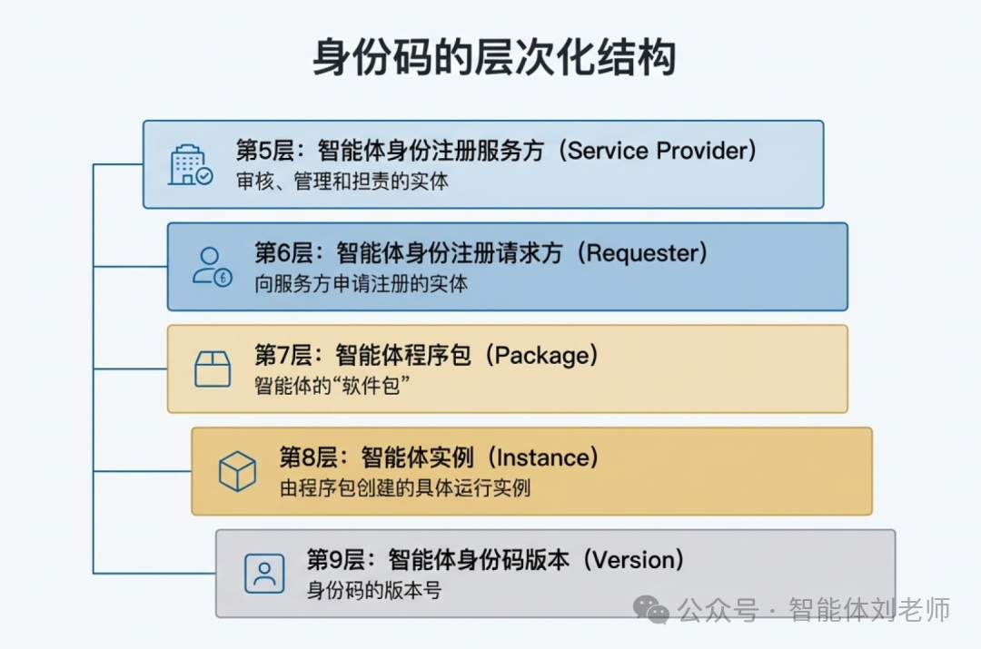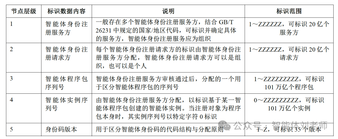 智能体身份码根据用途划分为5层节点,每一层节点的标识数据内容、说明、标识范围见下图: