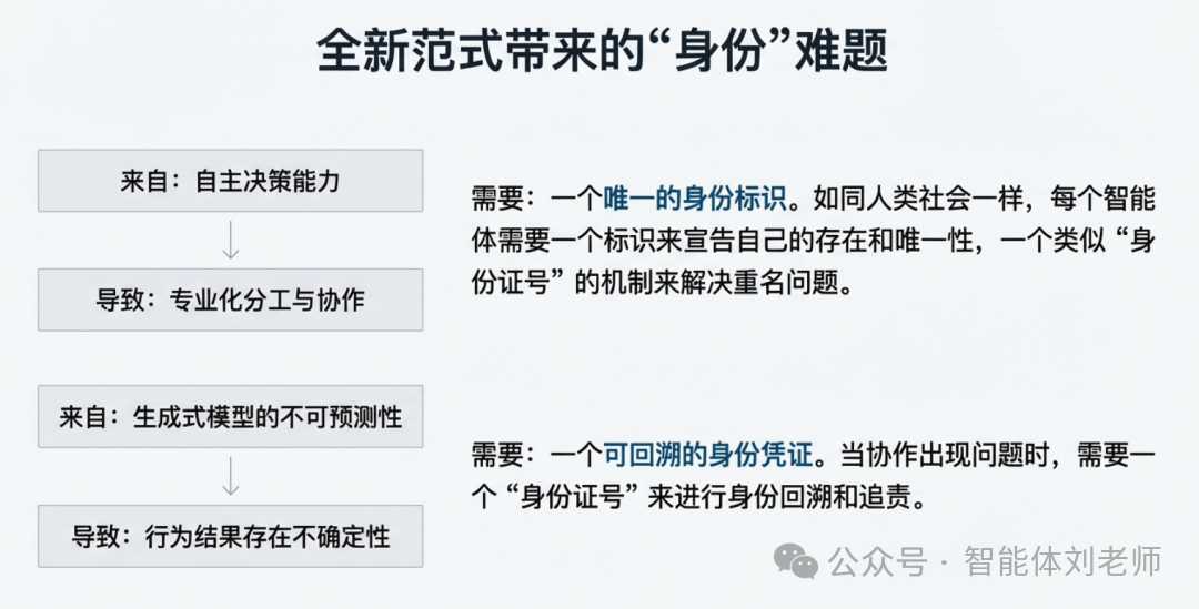 大模型带来智能体的强大能力同时,由于大模型以"生成式概率模型"为基础的技术局限性,也带来了智能体在执行时存在一定的不可预测性。也就是说,智能体就像人一样,存在一定的行为结果不可预测性。在这种情况下,当智能体在互联协作出现问题时,需要一个"身份证号"跟人类社会一样能在出现问题时进行身份回溯。