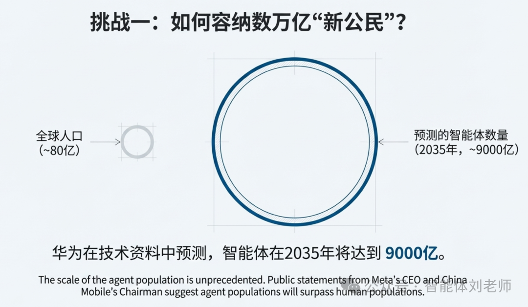如何适应未来庞大的智能体数量?跟之前所有的身份码定义不同,智能体身份码面临的第一个难题是如何适应未来庞大的智能体数量。可以这么简单理解,我们可以大胆地想象一下,如果未来所有的硬件终端都有一个控制智能体,未来所有的人都有若干个智能体助手,每个控制智能体和智能体助手都需要一定数量的专业智能体支撑,那智能体会达到什么数量级。Meta CEO扎克伯格、中国移动董事长都曾在公开场合表示,智能体的数量一定会超过人类。华为在技术资料中甚至大胆预测,智能体在2035年将达到9000亿。