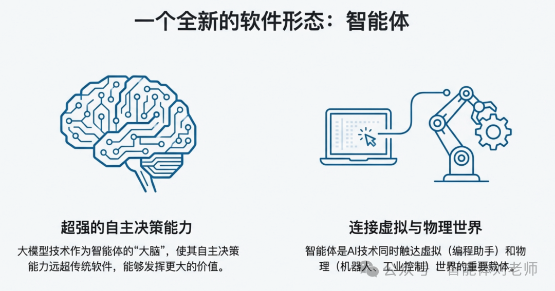 智能体是一种革命性的全新软件形态。简单来说,智能体的特殊性主要有两方面: