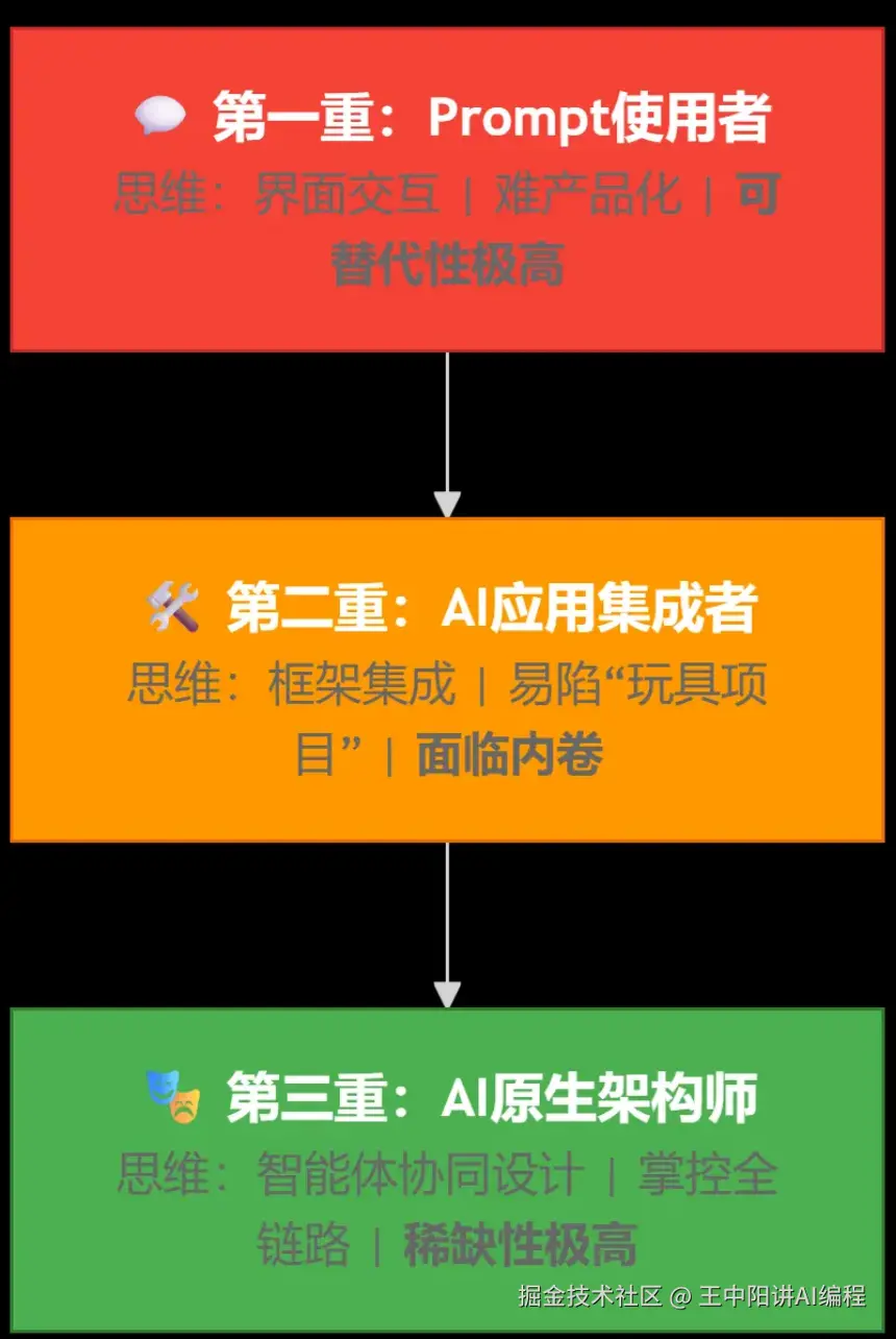 - 第一重:Prompt使用者 :熟练使用AI聊天工具,但能力无法产品化。可替代性:极高。