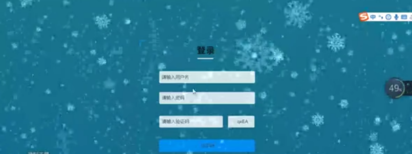 在登录模块的设计上,基于python的友好操作和开发,本次在登录的界面上设计了动态内容的显示,在蓝绿色的登录页面中背景选择了动态的雪花飘动,整体的背景显示流畅,通过色差的对比,提升了登录框的明亮度,可以在登录框中输入管理员的登录信息完成登录。