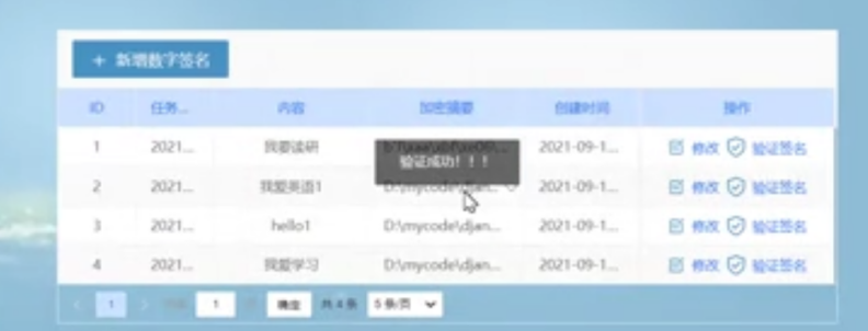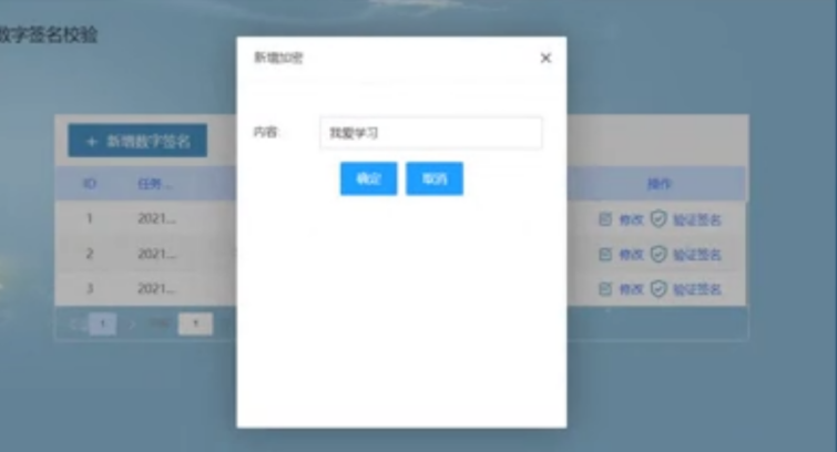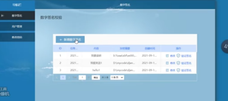 此次在数字签名的模块中设计了数字签名的添加功能,并且有已经生成数字签名的信息列表的内容显示。