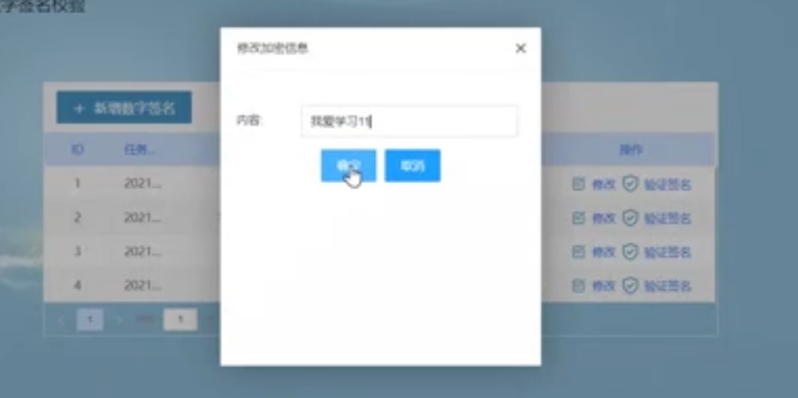 上述已经完成签名验证的信息,点击修改,将原有"我爱学习"的内容修改为"我爱学习11"点击确认完成内容的修改
