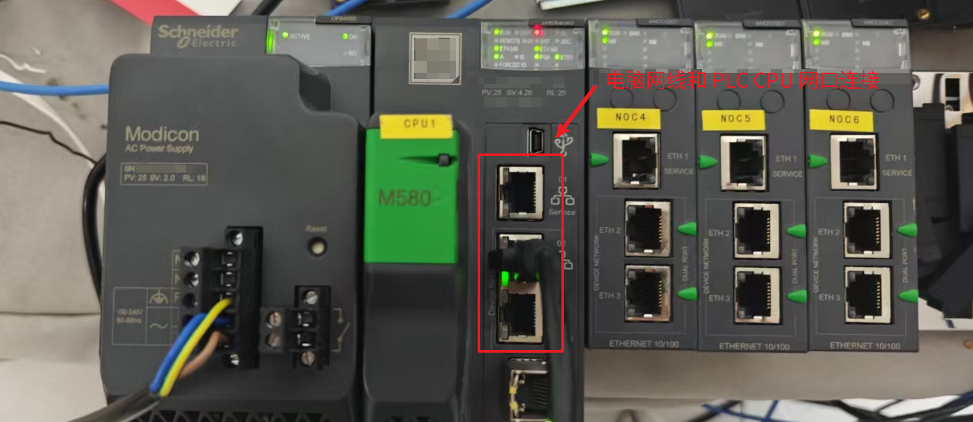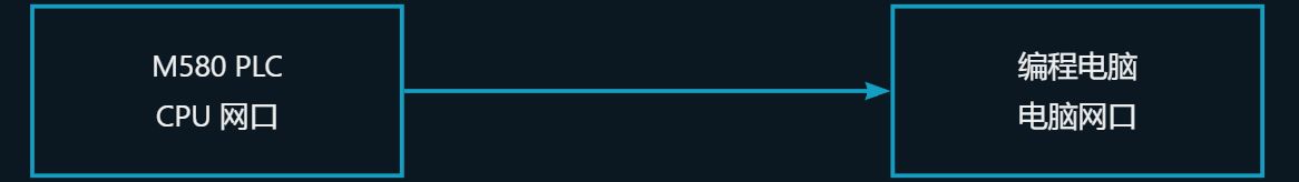 硬件连接:将 M580 PLC 的 CPU 模块上任意一个网口,连接到编程电脑的网口