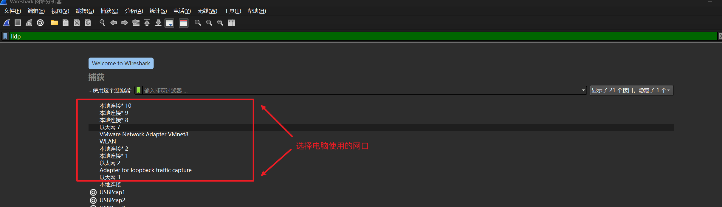 - 界面中的名称,如"以太网2"、"以太网3"、"以太网4"即为 Wireshark 抓包软件的名称