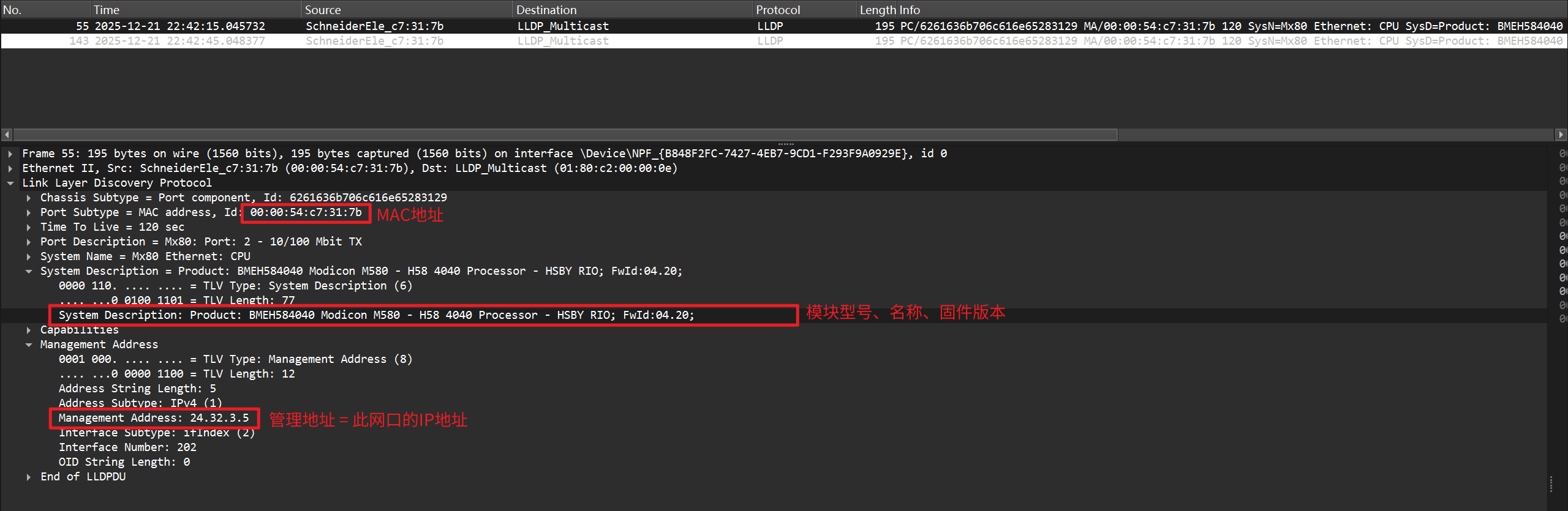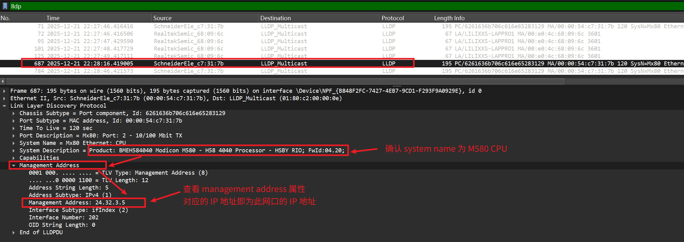 5. 在 Wireshak 抓包界面查看筛选到的数据,查找 source为 schneider_Elec 开头的数据包 6. 点击查看详情,确认System Description为Modicon M580 7. 找到management address(管理地址),此即为对应网口的 IP 地址 |