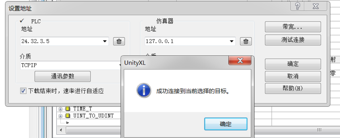 | 8. 验证:在 PLC 编程软件(这里是 Unity Pro XL V13.1)中测试连接,连接成功 注意:这里要先修改电脑网卡 IP 地址,然后使用 ping 指令测试,保证能连上对应模块 | ![]() |