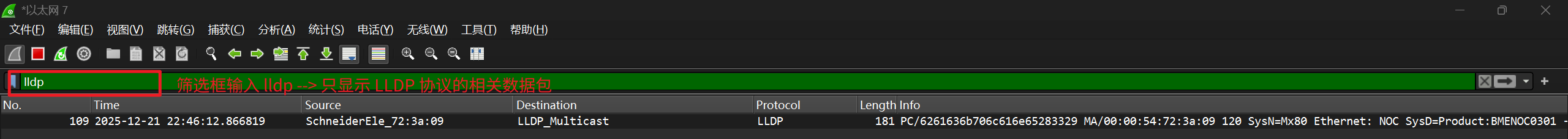 3. 筛选界面输入lldp 4. 等待 M580 PLC 网口发送 LLDP 协议数据包 |