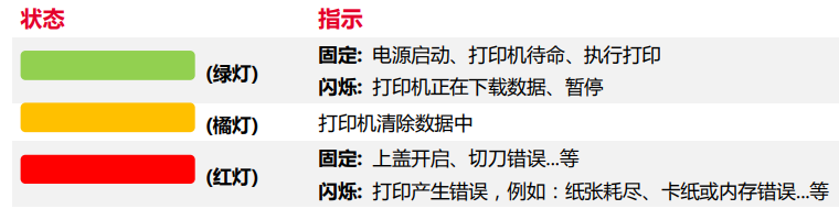 本打印机有一个按键和一个会显示三种颜色的指示灯,根据不同颜色的指示灯按下按键或配合电源开关,可让打印机启动多项功能,如:进纸、暂停印表机动作、校正标签感应器、列印出自测值、初始化打印机等。