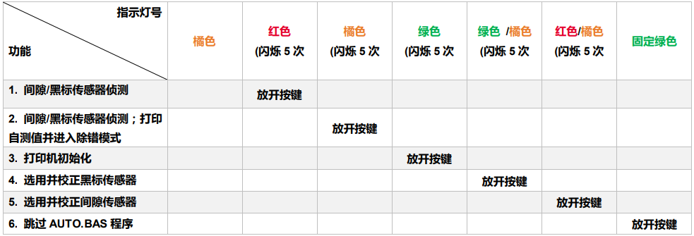 3.3依照下表所列,在所需启动的功能所示的灯号情况下放开按键。