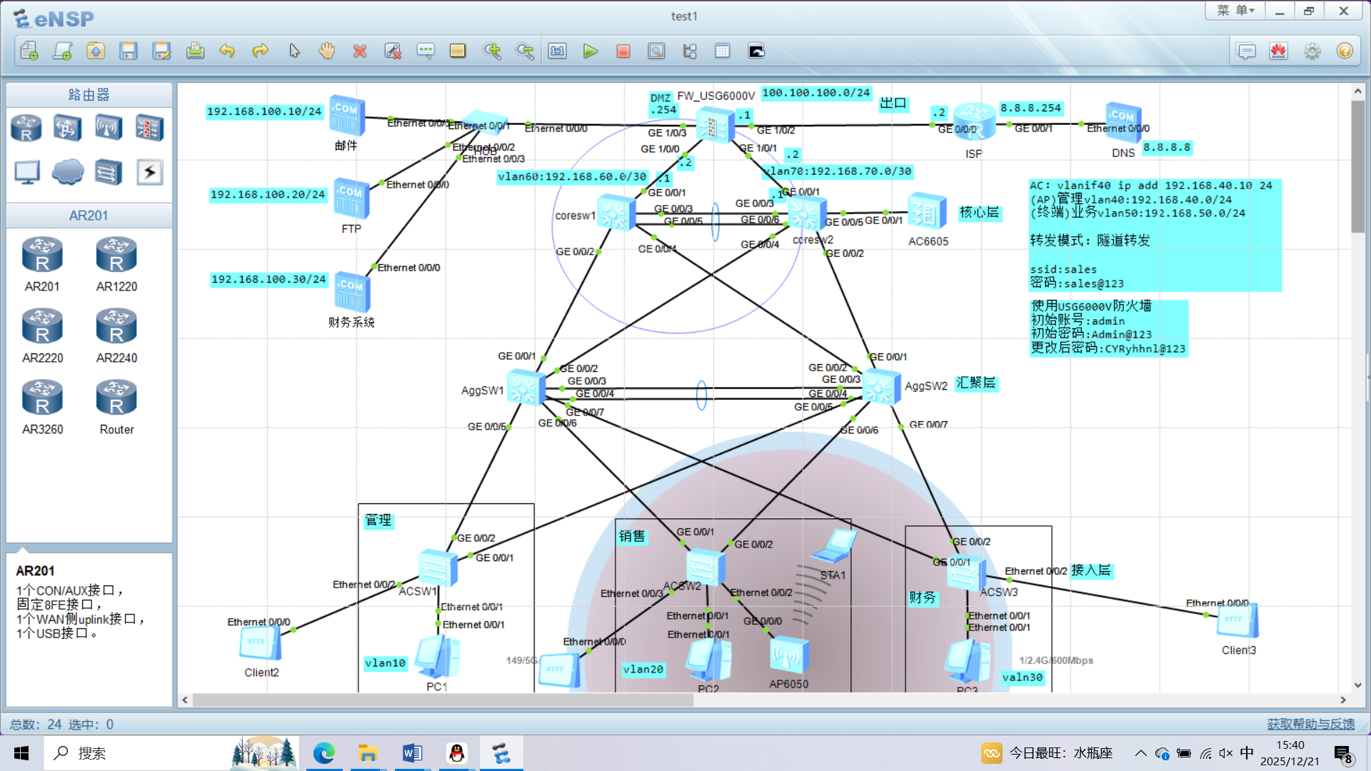 作为网络工程专业的核心实验,该 eNSP 拓扑完整呈现了三层交换架构、AC 集中式无线管理、出口安全控制的企业网典型方案,以下从专业维度拆解各模块的技术逻辑与配置要点:
