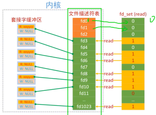 内核只检测这个集合中文件描述符对应的读缓冲区