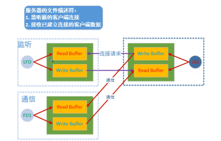 服务端需要用两个文件描述符去操作这两块内存。一个是用于监听的文件描述符,一个是用于通信的文件描述符。