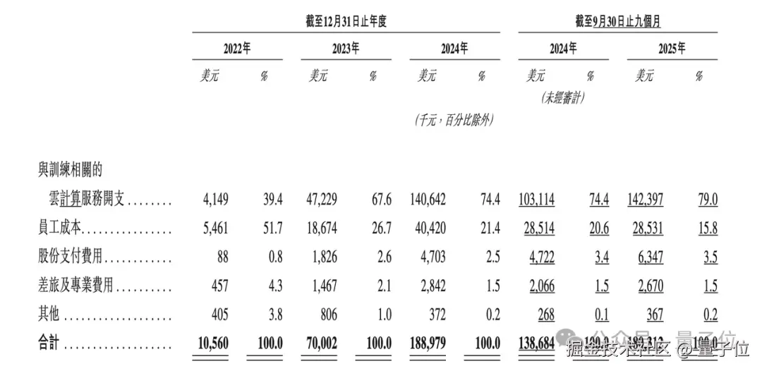 直观上看是训练成本的金额在持续提升,2022 年、2023 年、2024 年及 2025 年前九个月分别为 415 万美元、4723 万美元、1.4 亿美元和 1.42 亿美元。
