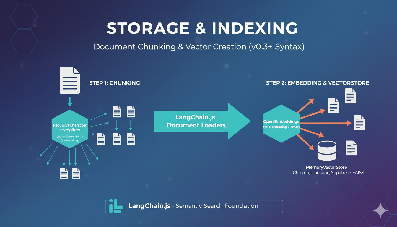 这里以 OpenAI 和 MemoryVectorStore (内存存储,适合测试) 为例。生产环境推荐使用 Chroma, Pinecone 或 Supabase。