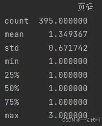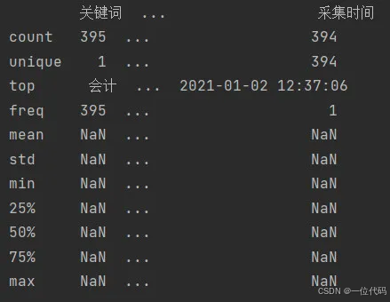 示例:不加任何参数,默认为只统计数值类型数据,包括均值、标准差、最大值、最小值、四分位数等。