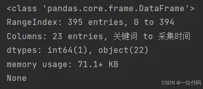 结果包括:行数(RangeIndex)、列数(Columns)、各个数据类型的列数(dtypes)等信息。