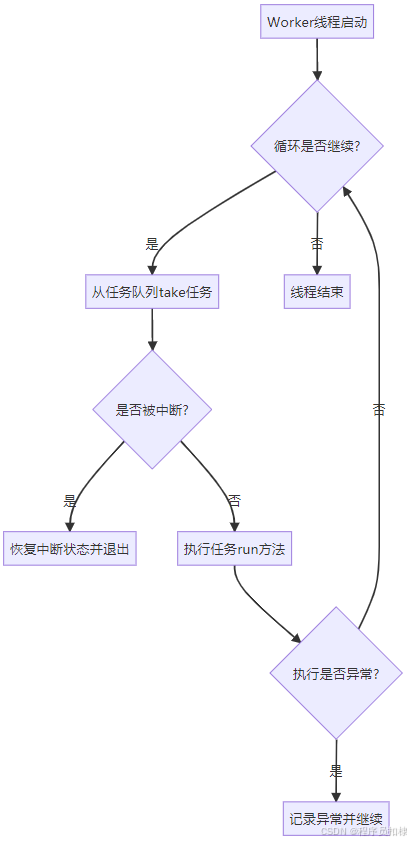 其中,工作线程(Worker) 是线程池执行的真正载体,它们被设计成常驻运行 的模式,通过一个循环结构不断地从任务队列中获取任务并执行。
