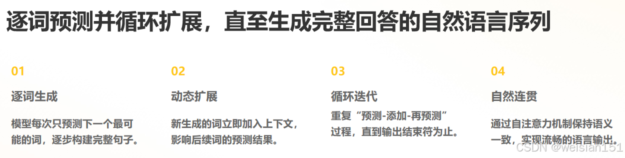 写下第一个词 → 根据第一个词预测第二个词 → 根据前两个词预测第三个词......