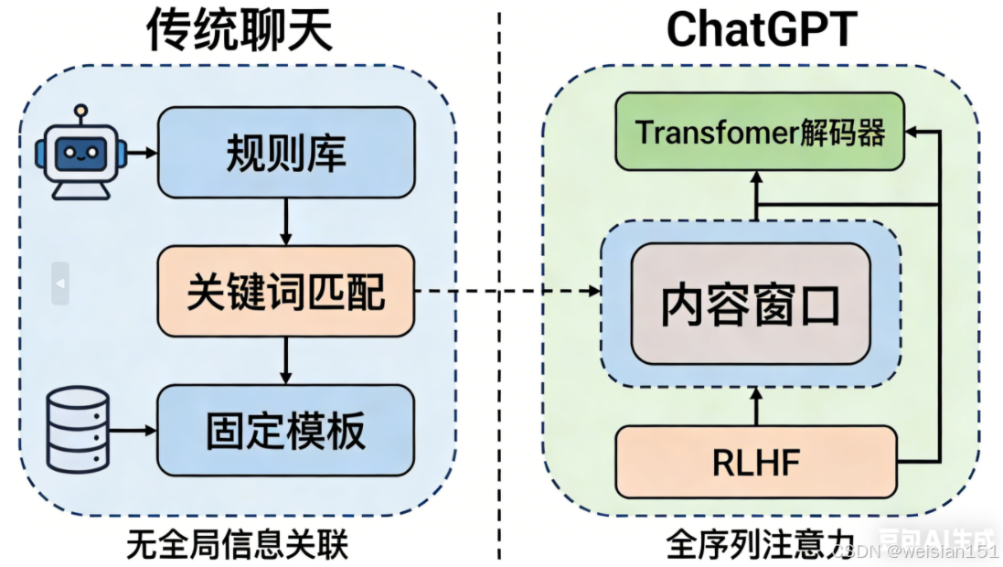 | 核心架构 | 基于规则或简单机器学习(如 RNN),只能处理固定场景 | 基于 Transformer 解码器,能理解复杂上下文,处理开放域对话 |