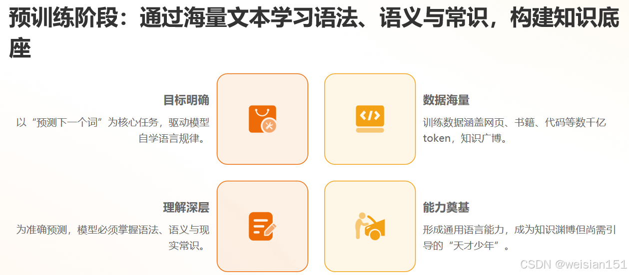 - 模型在海量文本(书籍、网页、论文等)中反复训练,相当于"读遍了互联网上的知识",逐渐学会了语言的规律和世界的常识。