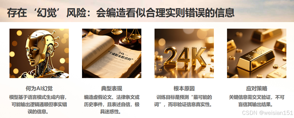 - ❌ 保证事实准确:会"幻觉"(hallucination),一本正经编造不存在的论文、法律条文;