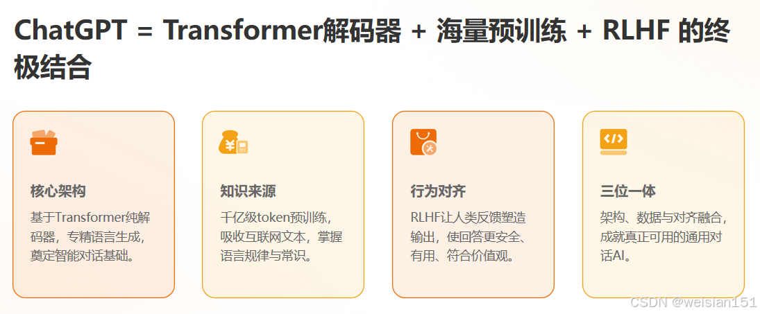 简单说:它的"骨架"是 Transformer 解码器,而它的"对话能力",则来自于三大关键技术的加持。