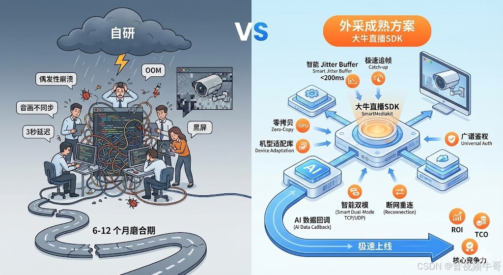 今天,我们继续深入探讨,在追求超低延迟 和高稳定性的RTSP播放场景下,外采成熟方案(以大牛直播SDK为例)相较于自研,究竟强在哪里?