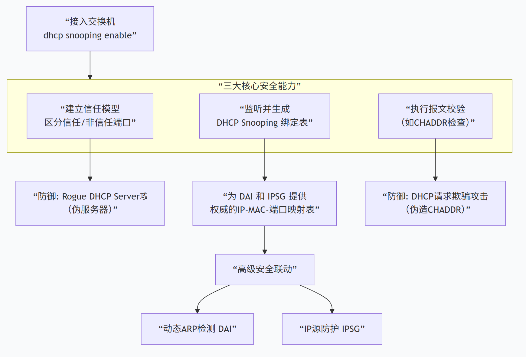 | DAI | "你声称的IP-MAC身份是真的吗?" | 2.5层 (ARP层) | 通讯录防伪警察。监听并审查所有更新内部通讯录(ARP表)的声明,防止有人张贴假号码。 |