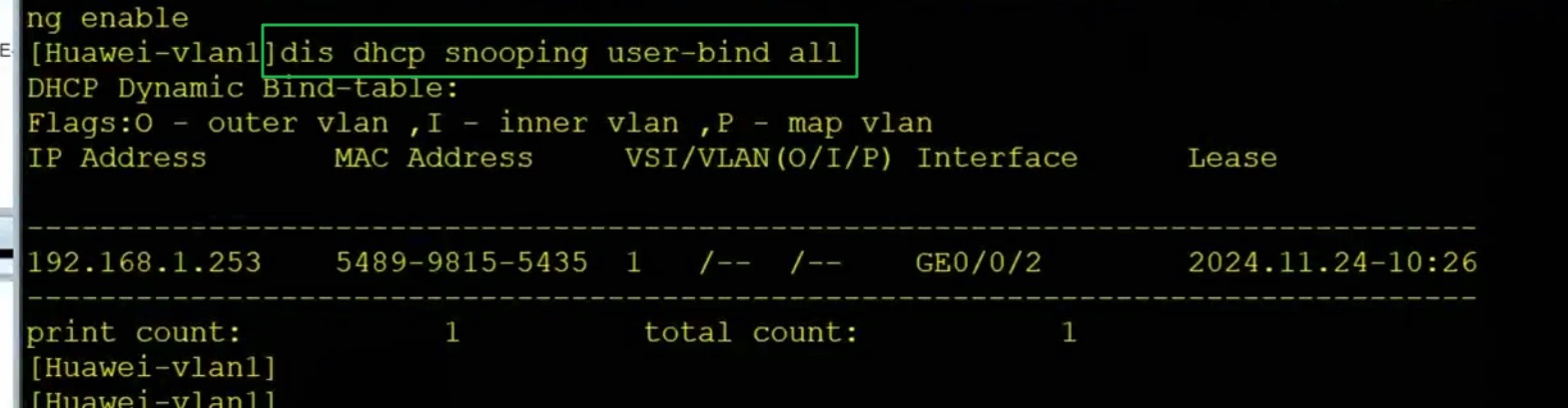 dhcp snooping enable # 这个命令在全局要敲,并且在vlan1下面也要敲