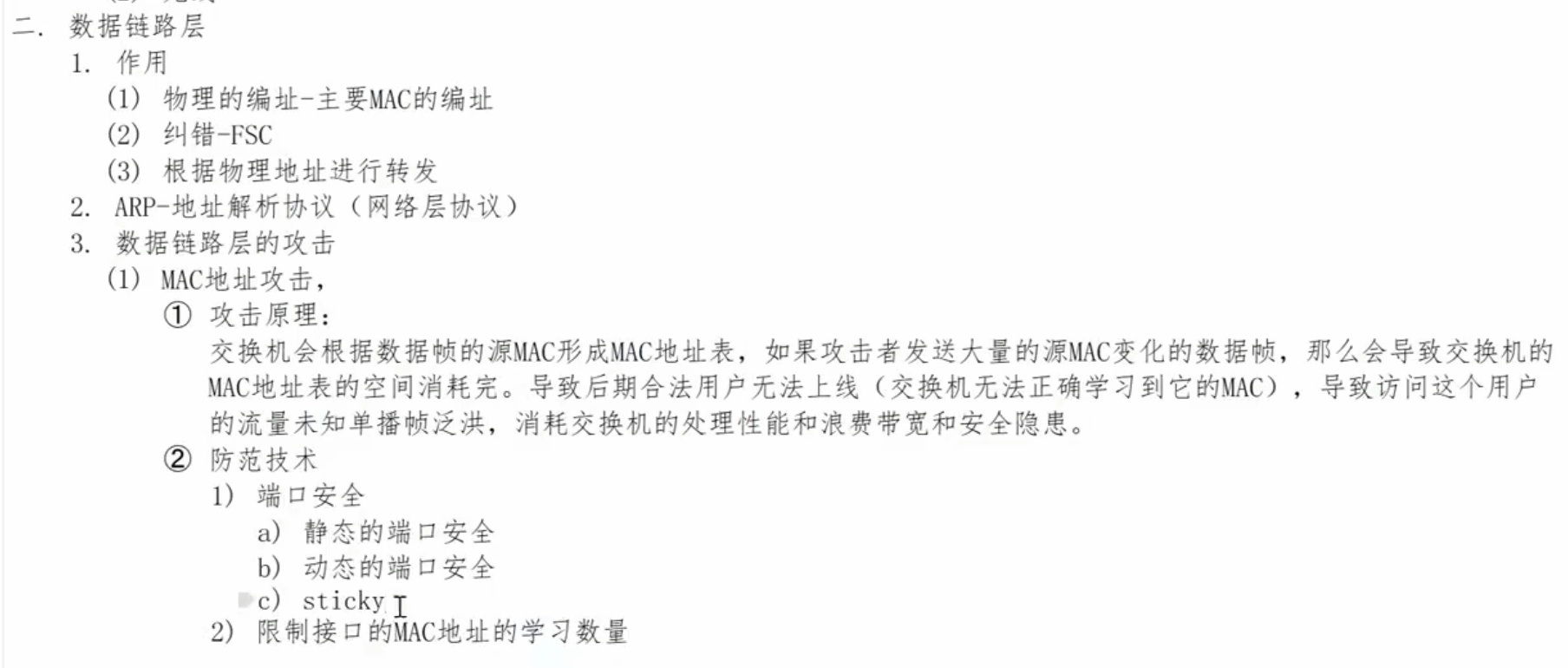 | 端口安全 | "这个物理端口能接哪台/几台设备?" | 数据链路层 (L2) | 大楼门禁。检查你的工牌(MAC地址),且一个工牌只能带有限的人(MAC数量限制)进入特定入口(端口)。 |