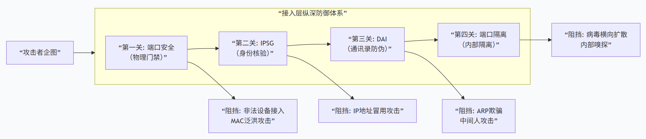 端口安全 :在攻击者物理接入网络的第一步就进行控制。