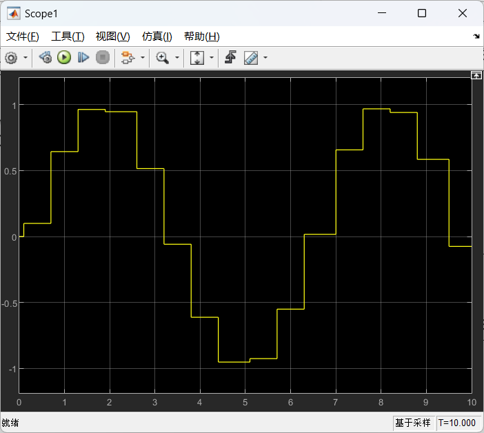 将Clock模块的信号输入MATLAB Function模块并使用Scope模块接收y端口的输出值,解算器设置为固定步长,值为1 ,仿真结果如图所示。