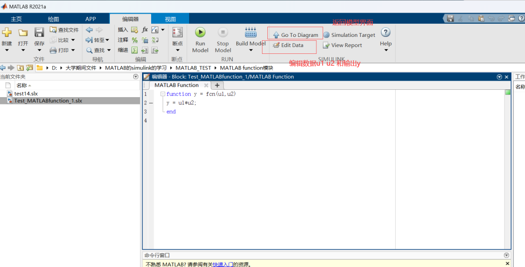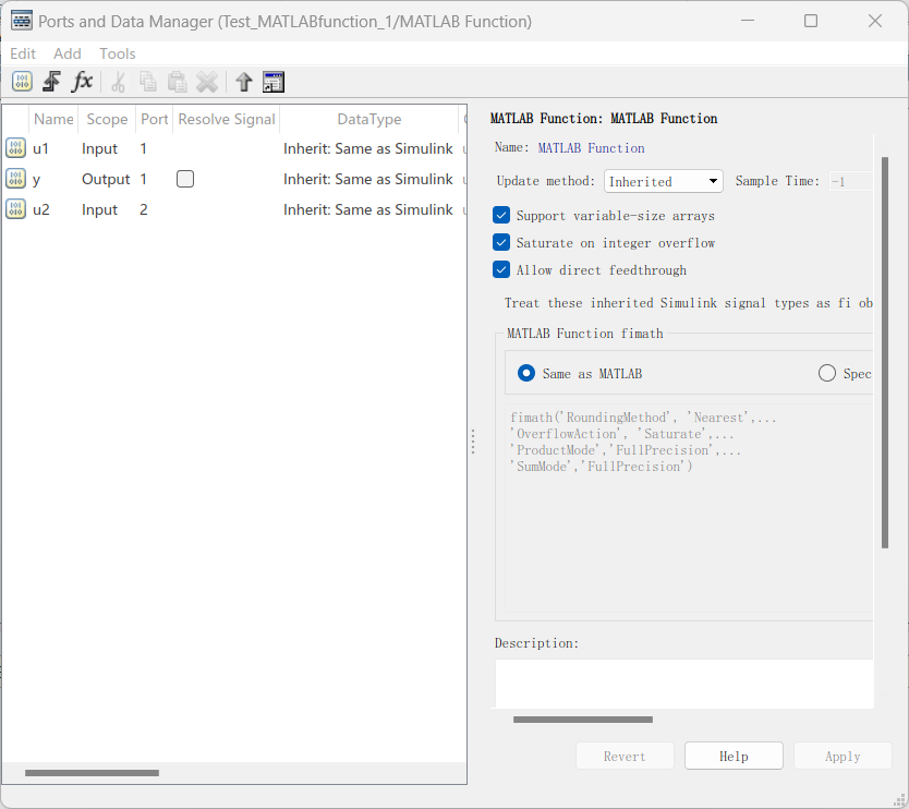 MATLAB Function是一个支持使用M语言编写模块功能,并能够将所编写的M语言生成C代码,用于开发桌面应用和嵌入式应用的模块。它支持的 MATLAB内建函数比 Fcn模块要广泛,除去基本的四则运算、逻辑操作符和关系操作符,还可以调用MATLAB各种工具箱里提供的内建函数,包括支持代码生成和不支持代码生成两个类型。