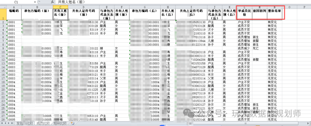成员比较:比较成员姓名、证件号码、与户主关系、性别等。形成三列比较结果:单成员比较会进行前后比对,是否成为了户主,是否增加、是否减少;原因初判断,会给出初步判断新生、死亡、外嫁、入赘等初步判断;整体结果,会对家庭成员变化做整体判断,是变化还是不变。