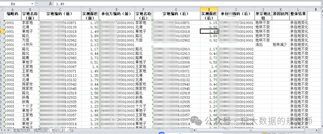 地块比较:地块名称、实测面积亩比较;同样形成三列:单宗地比较(变、不变);原因判断(面积增加、面积减少、新增地块、减少地块);整体结果(承包方地块变化、承包方地块不变)。