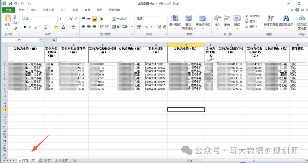 生成的数据为一个比对表,比对表里包含3个sheet:发包方比较、成员比较、地块比较。
