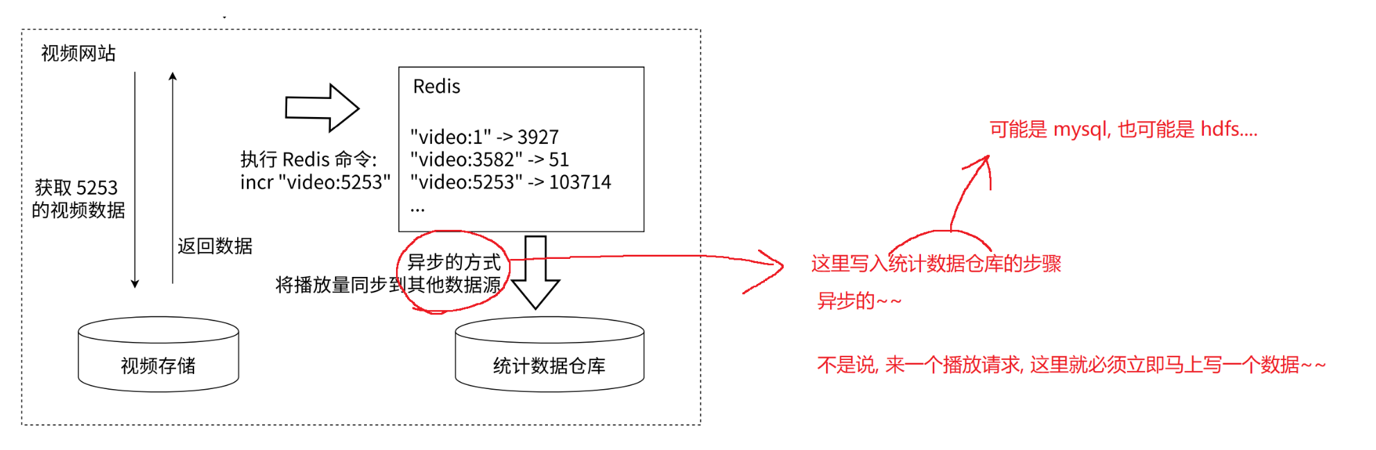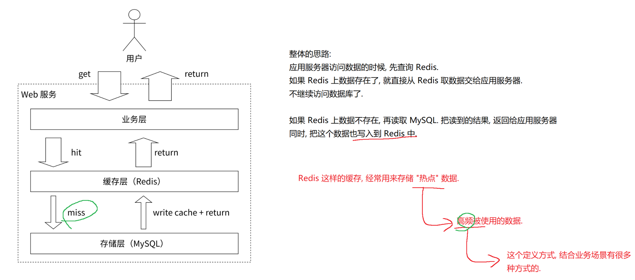 redis作为缓存,存储热点数据;查询数据,优先查询redis,若redis没有则查询数据库,然后同步一份给redis,返回;