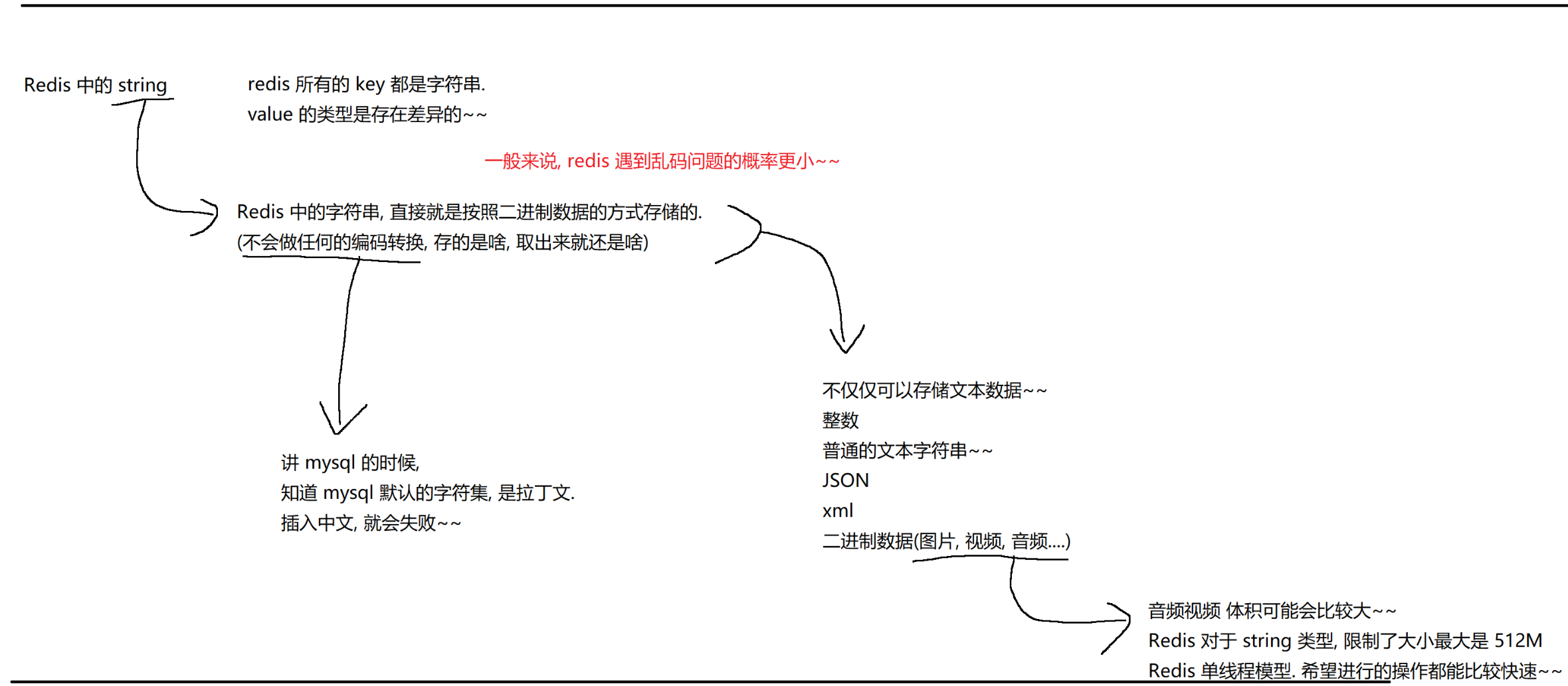 Redis中的字符串,直接就是按照2进制方式存储的(无任何编码转换)-> 2进制存储,那么不仅可以存储文本数据,还可以是整数、JSON、xml、2进制(图片、音频、视频...)-> 还是需要注意Redis是单线程模型,value长度不宜过长