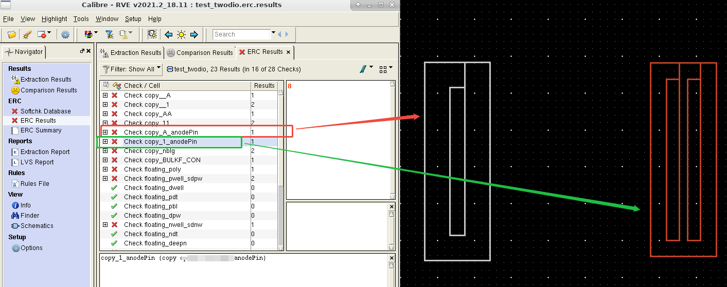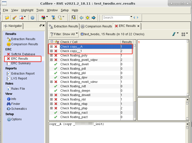 run lvs > ERC Results 查看 如果带有 x 说明已经被识别; ✔则是没有被抓到 在进行Highlight