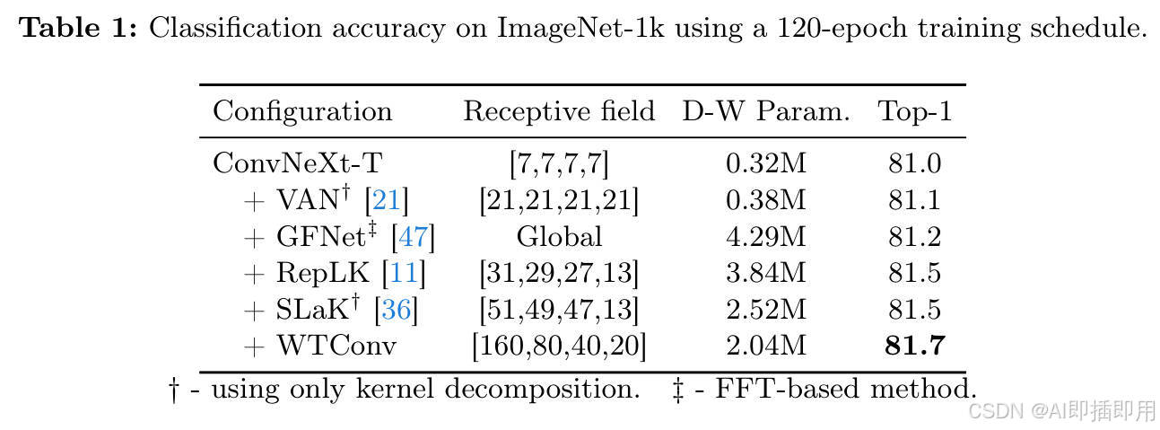 在 ConvNeXt-T 架构下,WTConv 达到了 82.5% 的 Top-1 准确率,超过了 Swin-T (81.3%) 和 ConvNeXt-T (82.1%),且参数量增加很少。