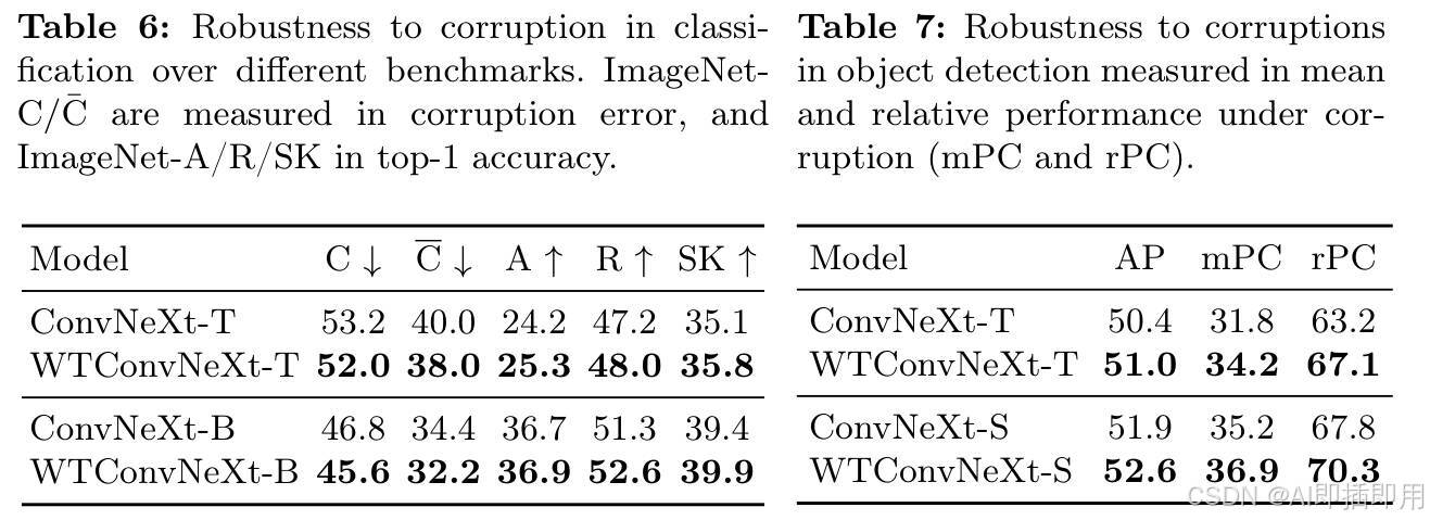 - 鲁棒性:在 ImageNet-C(腐蚀数据集)上,WTConv 的错误率明显低于基线,说明其学到的特征更加稳健。