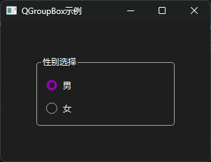 this->resize(300, 200);QWidget *centralWidget = new QWidget(this); this->setCentralWidget(centralWidget); QVBoxLayout *mainLayout = new QVBoxLayout(centralWidget); // 创建分组框 QGroupBox *genderGroup = new QGroupBox("性别选择", this); QVBoxLayout *genderLayout = new QVBoxLayout(genderGroup); // 创建单选按钮 QRadioButton *maleBtn = new QRadioButton("男"); QRadioButton *femaleBtn = new QRadioButton("女"); maleBtn->setChecked(true); // 默认选中"男" // 添加控件到分组框布局 genderLayout->addWidget(maleBtn); genderLayout->addWidget(femaleBtn); // 将分组框添加到主布局 mainLayout->addWidget(genderGroup); mainLayout->setContentsMargins(50, 50, 50, 50);}