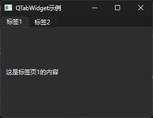 this->resize(300, 200);QTabWidget *tabWidget = new QTabWidget(this); this->setCentralWidget(tabWidget); // 标签页1 QWidget *tab1 = new QWidget(); QVBoxLayout *tab1Layout = new QVBoxLayout(tab1); tab1Layout->addWidget(new QLabel("这是标签页1的内容")); tabWidget->addTab(tab1, "标签1"); // 标签页2 QWidget *tab2 = new QWidget(); QVBoxLayout *tab2Layout = new QVBoxLayout(tab2); tab2Layout->addWidget(new QLabel("这是标签页2的内容")); tabWidget->addTab(tab2, "标签2"); // 默认选中标签页1 tabWidget->setCurrentIndex(0);}